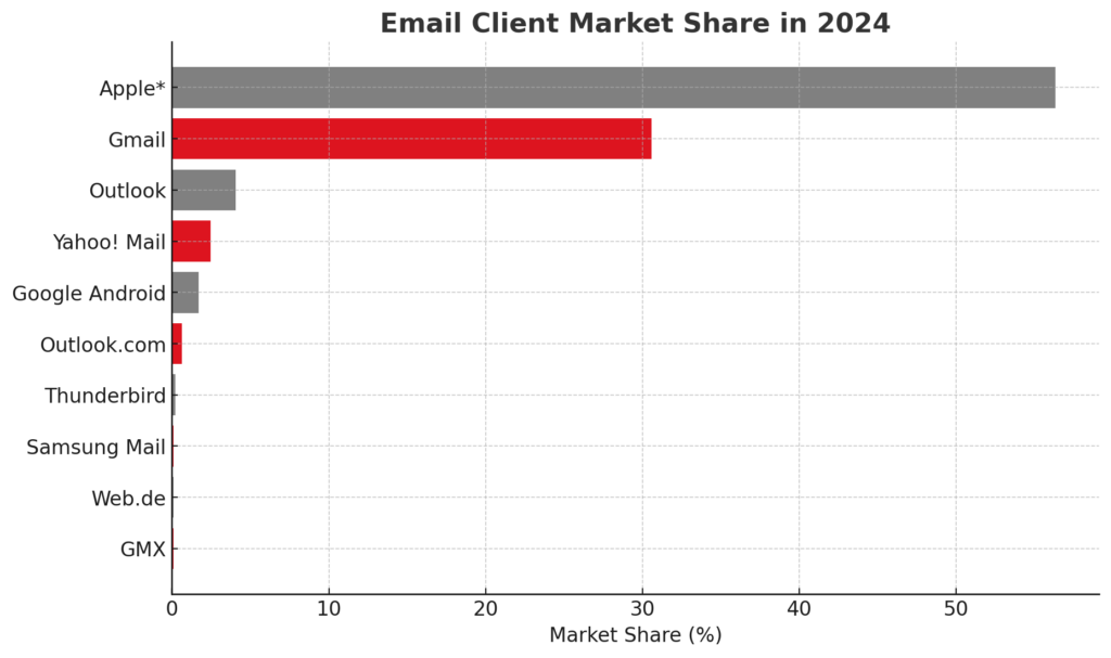 The graph highlights the variance in market share across different email clients, with Apple notably achieving the highest rate.